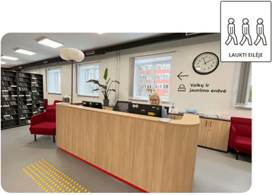 Čia yra informacinis stalas, prie kurio registruojami nauji skaitytojai, išduodamos knygos.